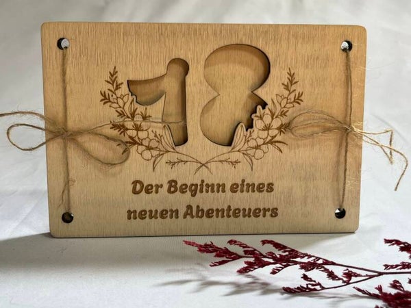 Diese elegante Karte besteht aus 3 mm dickem Pappelsperrholz, das durch seine natürliche Eigenschaften und warme Farbgebung einen rustikalen Charme verleiht. Sie wurde speziell dafür entworfen, dass Geldscheine oder Gutscheine dazwischen geklemmt werden können, um eine schöne und stabile Präsentation zu gewährleisten. Die Karte ist so gestaltet, dass sie die Scheine sicher hält, ohne sie zu beschädigen.