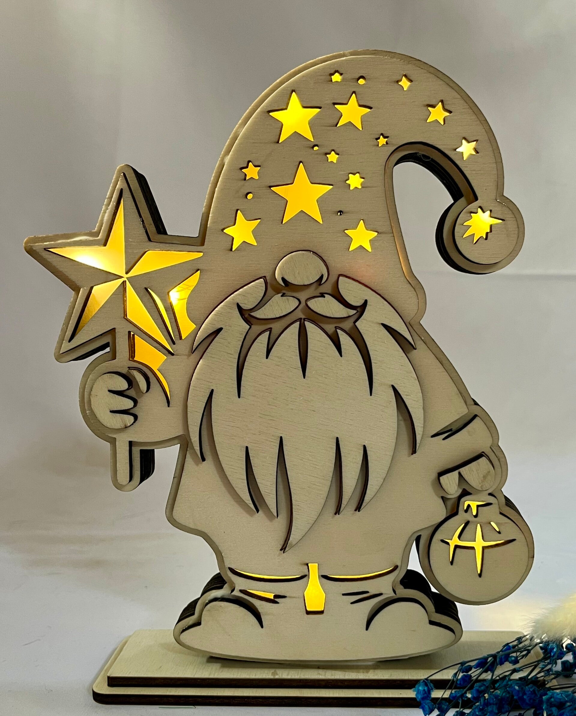 Besonders magisch wird die Dekoration durch die integrierte batteriebetriebene Lichterkette, die den Wichtel von innen sanft beleuchtet und für eine warme, festliche Atmosphäre sorgt. Das natürliche Material und das liebevolle Design machen ihn zu einem besonderen Highlight für Weihnachten, Winterfeste oder als Geschenk.