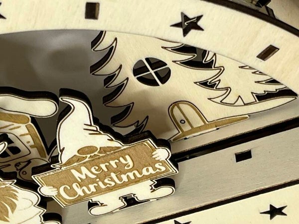 Grüne und schwarze Linien werden geschnitten, rote und graviert und orangene füllend graviert. Für die Beleuchtung habe ich eine kleine Drahtlichterkette verwendet.