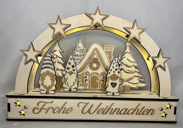 Grüne und schwarze Linien werden geschnitten, rote und graviert und orangene füllend graviert. Für die Beleuchtung habe ich eine kleine Drahtlichterkette verwendet.